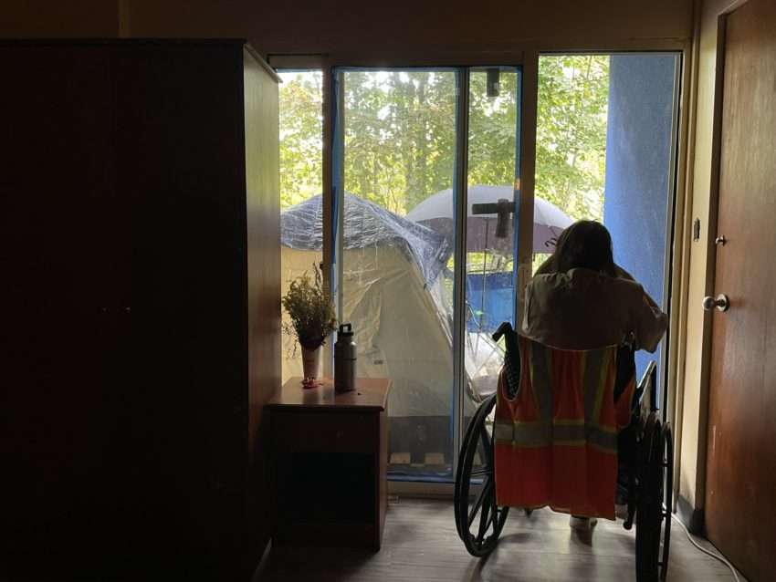 As colder temperatures approach, Duncan remains in her tent outside the Knights Inn just steps away from the highway and under several windows with cannabis and cigarette smoke. Her bedding is wet from the rain and snowfall the last few weeks.